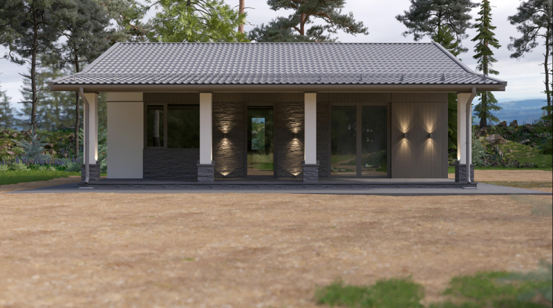 Кровля в варианте проекта 73 м2: кровля 4х скатная с отделкой из металлочерепицы, утеплитель насыпная мин вата, пароизоляция и ветрозащита. Водостоками и снегозадержателями комплектуется по дополнительному соглашению с клиентом. Подшив свесов кровли, осуществляется софитами. Балка муэрлата:100х150 мм, стропила и балки перекрытия 50х200 мм, обрешетка верхняя 32мм (через ряд, в местах повышенного скопления снега у конька и перед свесом обрешетка укладывается сплошным слоем.) Внутренняя обрешетка укладывается через 2 доски с последующим крепление для ГКЛ листов влагостойких.