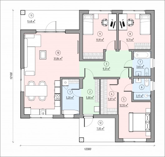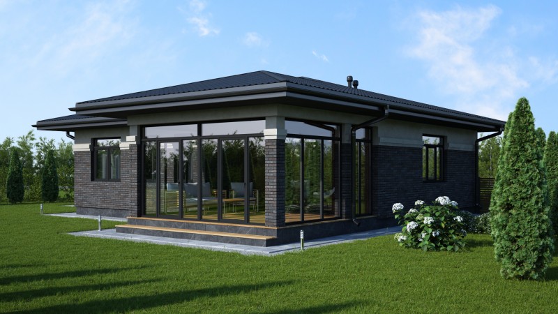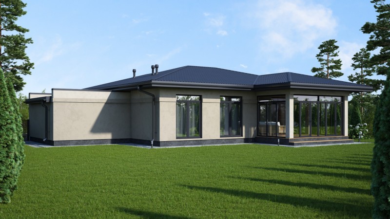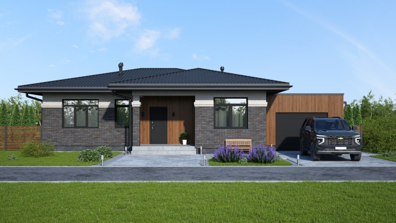 Красивый большой одноэтажный дом с оригинальными комбинированными фасадами, интересной кровлей и гаражом. Имеет три спальни, одна из них мастер спальня с гардеробной и санузлом, просторную кухню гостиную с выходом на террасу, котельную-постирочную, второй санузел, закрытое от осадков крыльцо и просторную террасу, гараж на один авто.