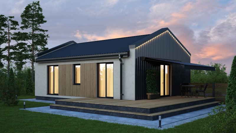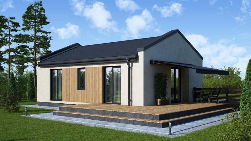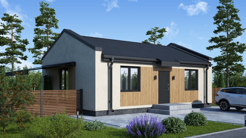 Компактный функциональный одноэтажный дом с оригинальным фасадом и двухскатной кровлей. Имеет две спальни, кухню гостиную с выходом на задний двор, котельную-постирочную, второй санузел можно разместить в котельной постирочной.