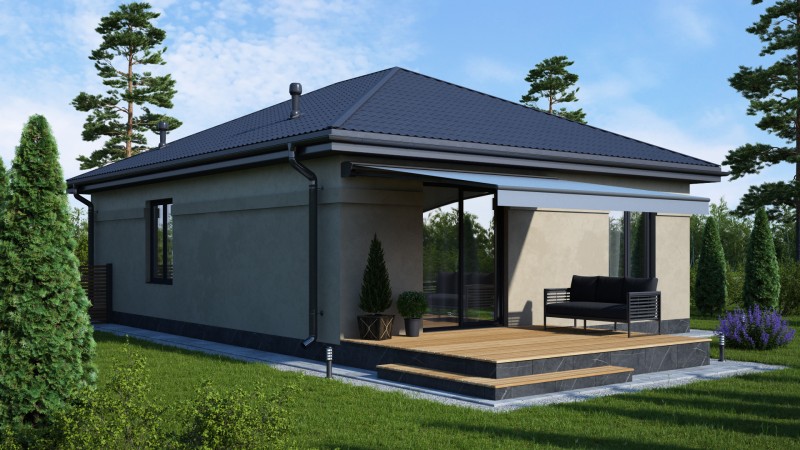 Компактный функциональный одноэтажный дом с оригинальным фасадом и интересной кровлей. Имеет три просторных спальни, кухню гостиную с выходом на задний двор, котельную-постирочную, второй санузел можно разместить в котельной.