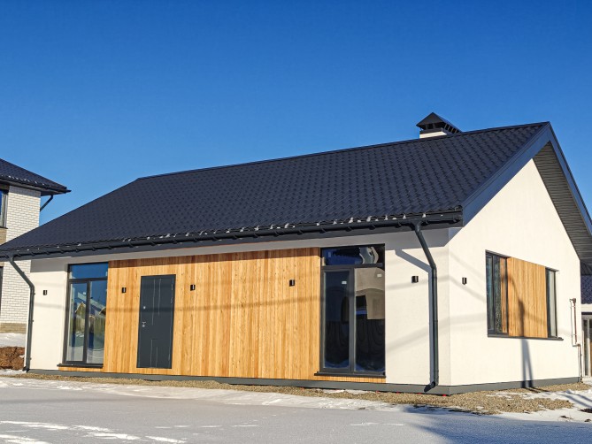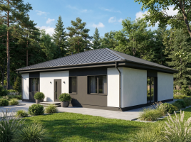 Лаконичный, экономичный дом обладает внутренней простотой. Планировкой предусмотрены просторная кухня-гостиная, три спальни, санузел и котельная. Комнаты квадратной формы позволяют наиболее эффективно использовать внутреннее пространство. Большие панорамные окна обеспечивают поток естественного света и красивый вид на окружающую природу. Этот дом — уютное и функциональное решение для тех, кто ценит практичность и простоту в деталях.