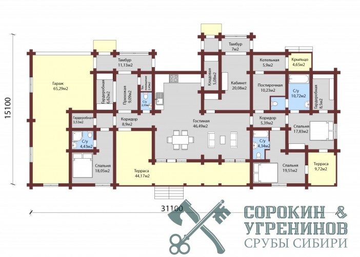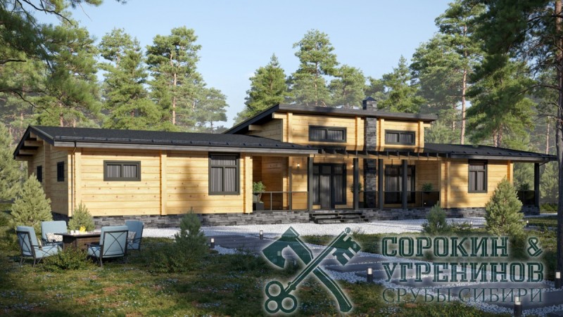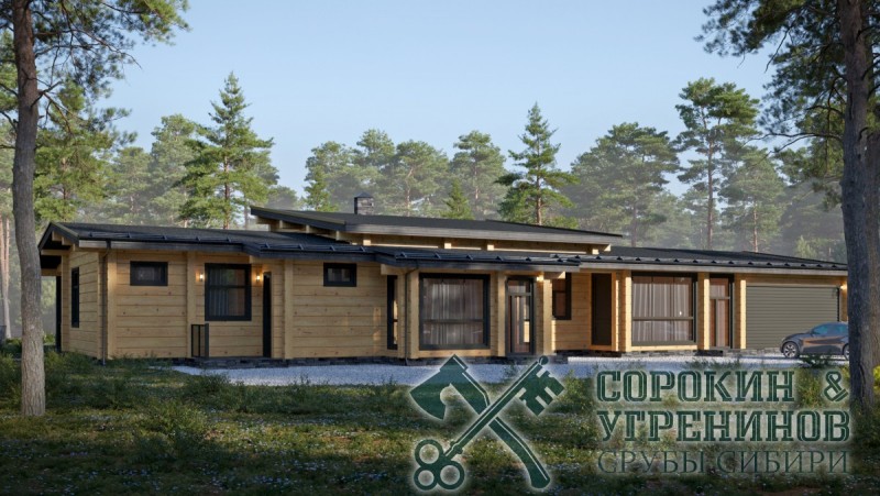 Индивидуальный проект одноэтажного жилого дома из лафета сечением 250х400мм. Общая площадь дома 371м2, размер сруба 15х31м. Большой дом в Европейском стиле, имеет четыре спальные комнаты, три санузла, кабинет, прихожая, гостиная, кухня, два выхода на террасы, гардеробная, котельная, большая гостиная с камином, прачечная, кладовая, и гараж.