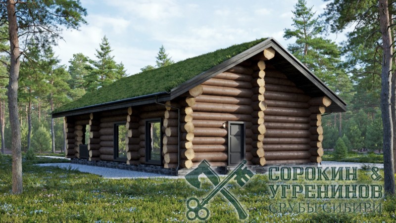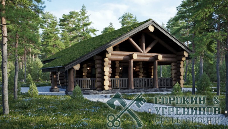 Эксклюзивный банный комплекс, сруб бани рубленый из бревна кедра большого диаметра 450мм, общей площадью 182,6м2. Размер сруба 9х15 метров по осям. Баня с мансардной крышей, и с антресолью. Просторная парная, помывочная, санузел, тамбур, гардеробная, комната отдыха и большая веранда, топочная с отдельным входом. зона барбекю. Баня проектировалась для базы отдыха санаторного типа, кровля на данном проекте была реализована живая, земляная с травой.