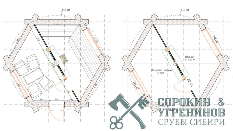 ХанБаня. Новый наш проект срубовой бани рубленый из бревна по форме Алтайского Аила, площадью 22м2. Сруб Аил-бани рубленый из бревна кедра диаметром 280мм, его размер по осям 6 на 6 метров. Объём бревна в срубе 20м3. Рубка сруба в классическом русском стиле с выделением карнизных балок. Большие панорамные окна в парной и комнате отдыха, придают невероятно стильный колорит бане, и отличный обзор изнутри. Отличительная особенность такого сруба шестиугольная форма в виде Алтайского дома Аила. Нет лишних помещений, только парная 11м2 и комната отдыха 11м2, и в ней же можно установить душевую кабину, хотя помыться можно и в парной. Обращаем Ваше внимание, данный проект мы решили показать на банном фестивале в Суздале, августе 2024. Сейчас производится наполнение, изобретена эксклюзивная печь Химера от ТМФ специально для фестивали и этой бани.