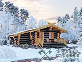 Сруб бани рубленый из бревна кедра диаметра 320мм, площадью 54,5м2 жилая и терраса 95м2. Размер сруба 8,6х11,6 метров по осям с учетом открытой террасы. Простая планировка бани, парная, душевая, комната отдыха, санузел, и большая терраса. Необычный вид создает стропильная система кровли из гнутых стропильных балок. Такая кровля будет дороже за счет гнутых клееных стропильных балок. Сруб рубленый вручную в русскую чашу (охлоп), брёвна окоренные гидро-окоркой (водой под высоким давлением), а так, же это можно сделать скобелем или лопатой, или строганное рубанком. Объем бревна в срубе 65м3.