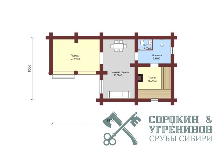 Сруб бани рубленый из большого бревна кедра диаметром 500мм площадью 81,62м2. Размер сруба 8Х15,5 метров по осям. Баня с террасой для барбекю. Парная, мойка, комната отдыха и сунузел. Сруб рубленый вручную (канадская рубка), брёвна окоренные гидро-окоркой (водой под высоким давлением), а так, же это можно сделать скобелем или лопатой, или строганное рубанком. Объем бревна в срубе 90м3.