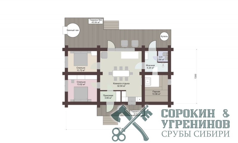 Гостевой дом с баней внутри, Отличное решение для загородного отдыха. Сруб рубленый из бревна кедра диаметром 280-320мм, общей площадью 133м2. Размер сруба 7,2х13,8 метров. Строение имеет две спальные комнаты, гостиная комната совмещена с кухней, объемная русская парная, помывочная душевая, санузел, прихожая. И есть большая терраса с встроенной купелью или с банным чаном, который можно подогревать дровяной печью. Данный проект будет изюминой любого туристического комплекса, загородного отеля, спа-комплекса.