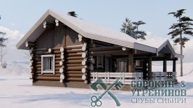 Проект загородного дома с баней внутри, рубленый из лафета сечением 250х400мм. Общая площадь дома 75м2. Одноэтажный дом имеет одну спальную комнату, есть просторная гостиная с кухней, парную с печью на дровах, душевая, и санузел, прихожая с гардеробом, и крыльцо.