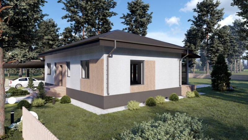 Рады представить нашу новинку — проект одноэтажного дома с мастер — спальней, оборудованной собственным с/у и гардеробной. Отличительной особенностью этого дома также являются французские окна с выходом на террасу из двух спален и кухни — гостиной, имеющей эргономичную форму, позволяющую визуально разделить зоны приготовления пищи, столовой и отдыха. В функциональной котельной помимо инженерного оборудования можно свободно разместить домашнюю прачечную, зону хранения и даже лапомойку для любимых питомцев. Фасад дома может быть выполнен как в классическом кирпиче, так и в штукатурке. Возможна зеркальная планировка. Глухая боковая стена позволяет в дальнейшем пристроить навес для автомобиля или гараж на 1-2 машиноместа.