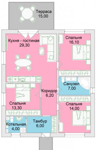 Внутри дома расположены три просторные спальни площадью 13, 14 и 16 квадратных метров, которые идеально подходят для комфортного отдыха каждого члена семьи.