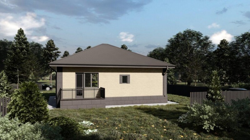 Данный вариант проекта предполагает наличие в доме тамбура-прихожей (5 кв.м.), котельной (4 кв.м.), кухни-гостиной (22,5 кв.м.), санузла с окном (5 кв.м.), трех жилых комнат (15, 2 кв. м., 14,7 кв. м. и 13,8 кв.м.).